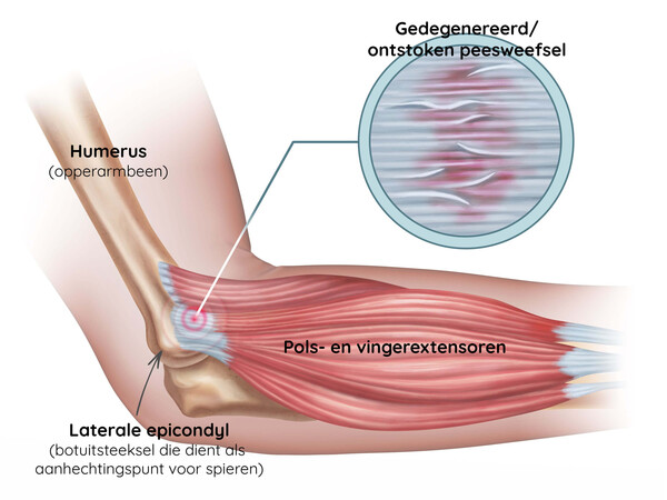 Epicondylitis lateralis, vaak beschreven in de literatuur als tendinopathie (degeneratie van peesweefsel), presenteert een complex klachtenbeeld dat een combinatie lijkt van een lokaal peesprobleem, verstoring in de pijnperceptie en motorische stoornissen (bewegingsproblemen). Het meest voorkomende symptoom is pijn in het buitenste gedeelte van de elleboog, vaak gerelateerd aan de extensor carpi radialis brevis spier, een handstrekker aan de duimzijde. Deze aandoening wordt verondersteld veroorzaakt te worden door kleine beschadigingen in het peesweefsel van de pols- en vingerextensoren, als gevolg van overbelasting. Het daaruit voortkomende granulatie- (jong, vaatrijk weefsel dat in een herstellende wond voorkomt) en littekenweefsel kan bij herhaalde belasting verder beschadigen en leiden tot verdere degeneratie van het peesweefsel. Onderzoek suggereert dat deze aandoening gepaard gaat met degeneratieve veranderingen, maar zonder de aanwezigheid van ontstekingscellen, waardoor 'epicondylosis' eigenlijk een nauwkeurigere benaming zou zijn. De term 'epicondylitis', vaak gebruikt in literatuur (waar 'itis' ontsteking betekent), dekt dus niet volledig de lading. Deze aandoening komt regelmatig voor, met een geschatte frequentie van 5 tot 8 per 1.000 personen, evenredig verdeeld over mannen en vrouwen, voornamelijk in de leeftijdscategorie van 40 tot 50 jaar. Bouwvakkers lopen in het bijzonder risico, met 2,5 keer meer kans op het ontwikkelen van de aandoening in hun dominante arm.