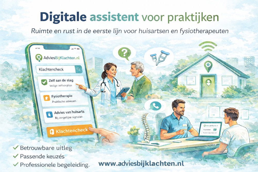 We merken dat digitalisering in de eerste lijn vaak wordt gezien als “extra”. Terwijl het juist kan helpen om zorg rustiger en duidelijker te maken — vóór, tijdens én na het consult. Daarom wordt AdviesBijKlachten.nl steeds vaker gebruikt als digitale assistent naast de behandeling: als plek waar mensen thuis rustig kunnen nalezen wat verstandig is, met heldere uitleg en passende vervolgstappen.
