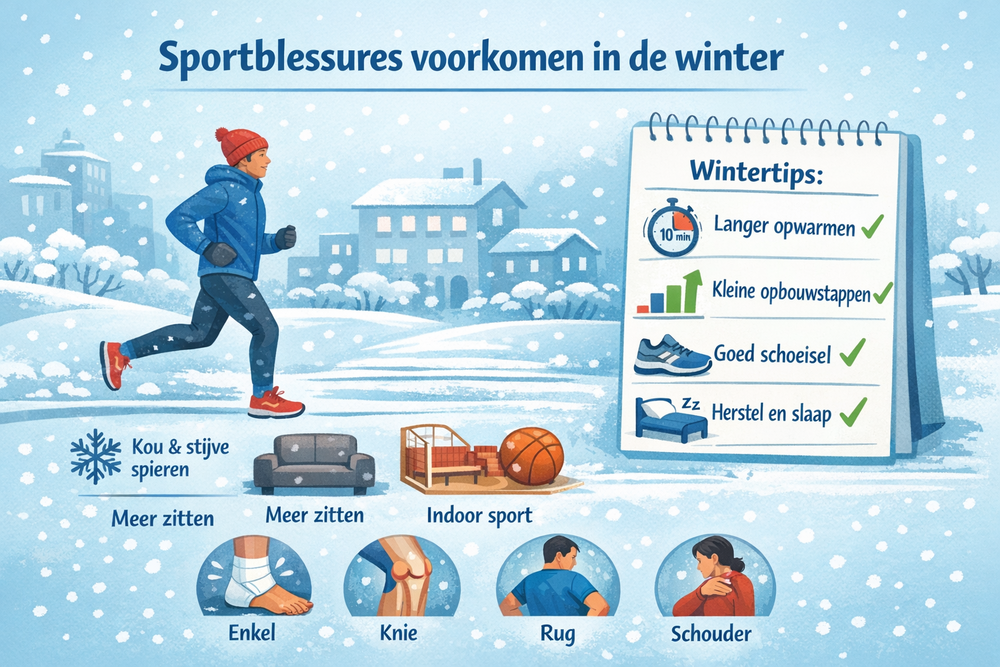 In dit artikel lees je wat er in de winter verandert en hoe je blessures voorkomt met praktische, haalbare stappen — inclusief tips per regio: enkel, knie, rug en schouder.