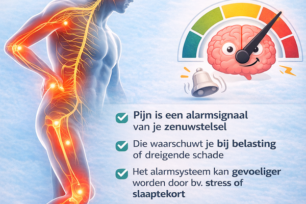 Pijn is geen röntgenfoto. Pijn is een alarmsignaal van je zenuwstelsel. En dat alarmsignaal kan harder of zachter afgesteld staan — afhankelijk van slaap, stress, conditie, eerdere blessures, verwachtingen en hoe “veilig” je brein de situatie inschat.