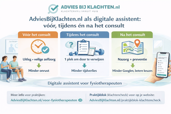 De kern: AdviesBijKlachten.nl is niet alleen een triage-tool voor bezoekers, maar ook een praktisch hulpmiddel voor fysiotherapeuten en huisartsen om patiënten te begeleiden met duidelijke informatie, passende vervolgstappen en minder ruis.